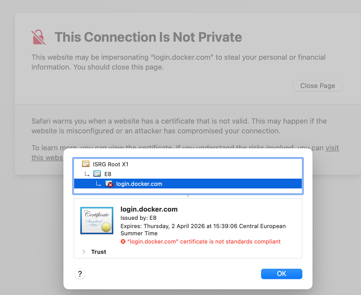 the Docker login website was the first one I had problem with in Safari. Meanwhile, Safari shows this error on many other websites. It appears there’s some problem on my macOS with Certificate Transparency checking.