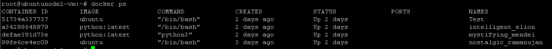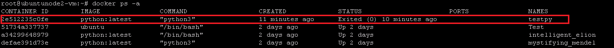 For instance the 2nd container must have been started with a command like this ‘docker run -ti -d python:latest /bin/bash’ The 3rd propably with ‘docker run -ti -d python:latest’